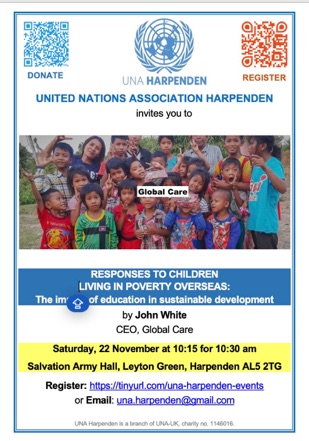 Saturday 22nd November at 10:30 am. UNA Harpenden will be hosting a public lecture on Responses to Children Living in Poverty Overseas: The impact of education in sustainable development by John White, CEO of Global Care, at the Salvation Army Hall, Leyton Green, Harpenden AL5 2TG. Click here for more information about the talk and the speaker. Register here for the talk