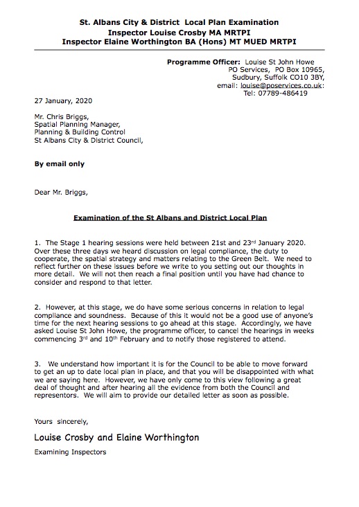 Jan 28. ‘Serious concerns in relation to legal compliance and soundness’ say examining inspectors of the SADC Local Plan following a week of sessions in St Albans.