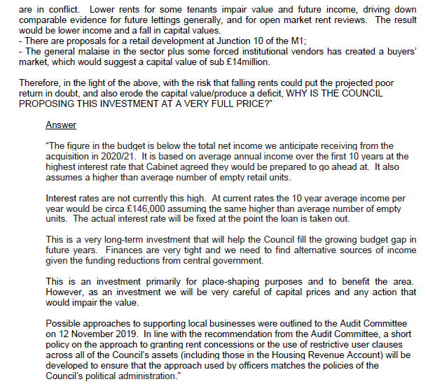 The Lib Dem run District Council is proposing to hand over £18.8 million to acquire a complex site on Harpenden High St including a large number of retail properties and flats. Approximately 107% of the cost of the acquisition will be funded through borrowing.