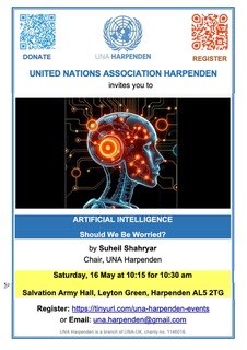 UNA Harpenden will be hosting a public lecture on Artificial Intelligence: Should We Be Worried? by Suheil Shahryar, Chair of UNA Harpenden, at the Salvation Army Hall, Leyton Green, Harpenden AL5 2TG. Register here for the talk.