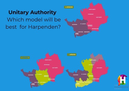 The Harpenden Society committee notes that the government is determined to reorganise local government by creating unitary authorities. We hope that it does indeed make for greater efficiency, reducing bureaucracy and overlap.