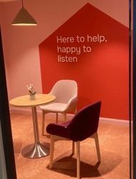 The spacious interior is light and airy with a large counter, a private office for consultations, Helpful online booths, and two electronic information display units.