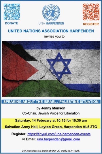 UNA Harpenden will be hosting a public lecture on Speaking about the Israel / Palestine Situation by Jenny Manson, Co-Chair of Jewish Voice for Liberation,