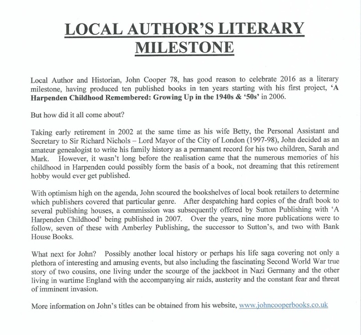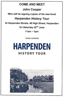 SEPT. READ a review of John Cooper’s (centre- with the manager -right and staff at Harpenden Books) new book. ‘HARPENDEN HISTORY TOUR’.