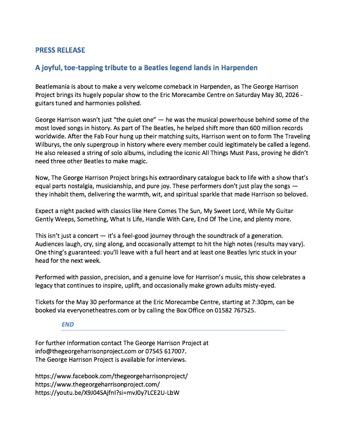 The George Harrison Project will be bringing their acclaimed live show to the Eric Morecambe Centre, Harpenden, on Saturday, 30th May