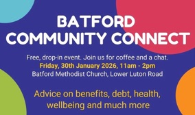 A free, drop-in event for the Batford community on Friday 30th January 2026 from 11am-2pm at Batford Methodist Church. Learn more