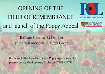 The Royal British Legion will be conducting a ceremony to mark the Opening of the Field of Remembrance and the launch of this year's Poppy Appeal at 11.00am at the War Memorial, Church Green. To see details of this year's Remembrance Day Parade and Service on 9 November, click here.