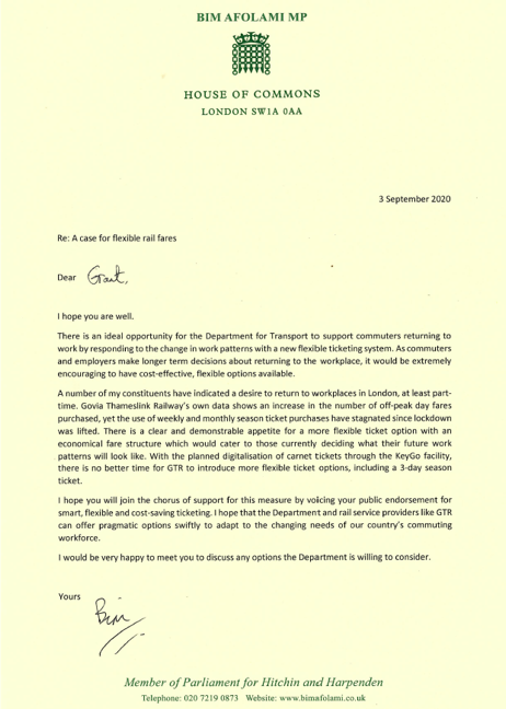 Harpenden M.P. Bim Afolami suggests 3 day season tickets to Grant Shapps, the Government Secretary of State for Transport.