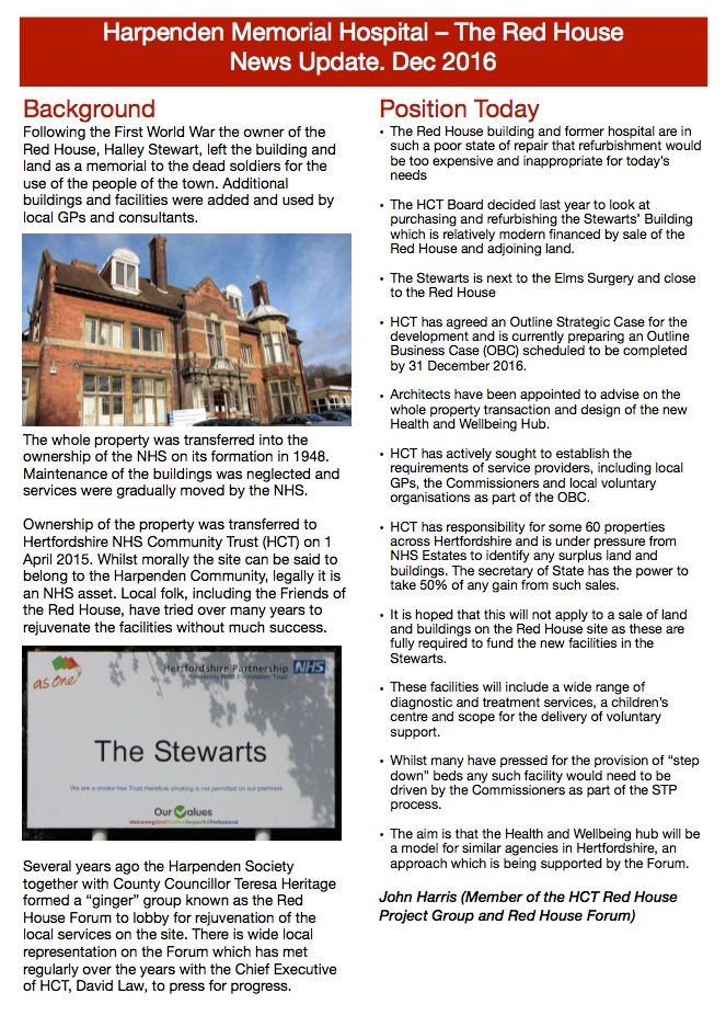 FEB. The future of the Red House development (AKA Harpenden Health and Wellbeing Centre ) thrown into doubt by fundamental changes in NHS operating structures just announced.